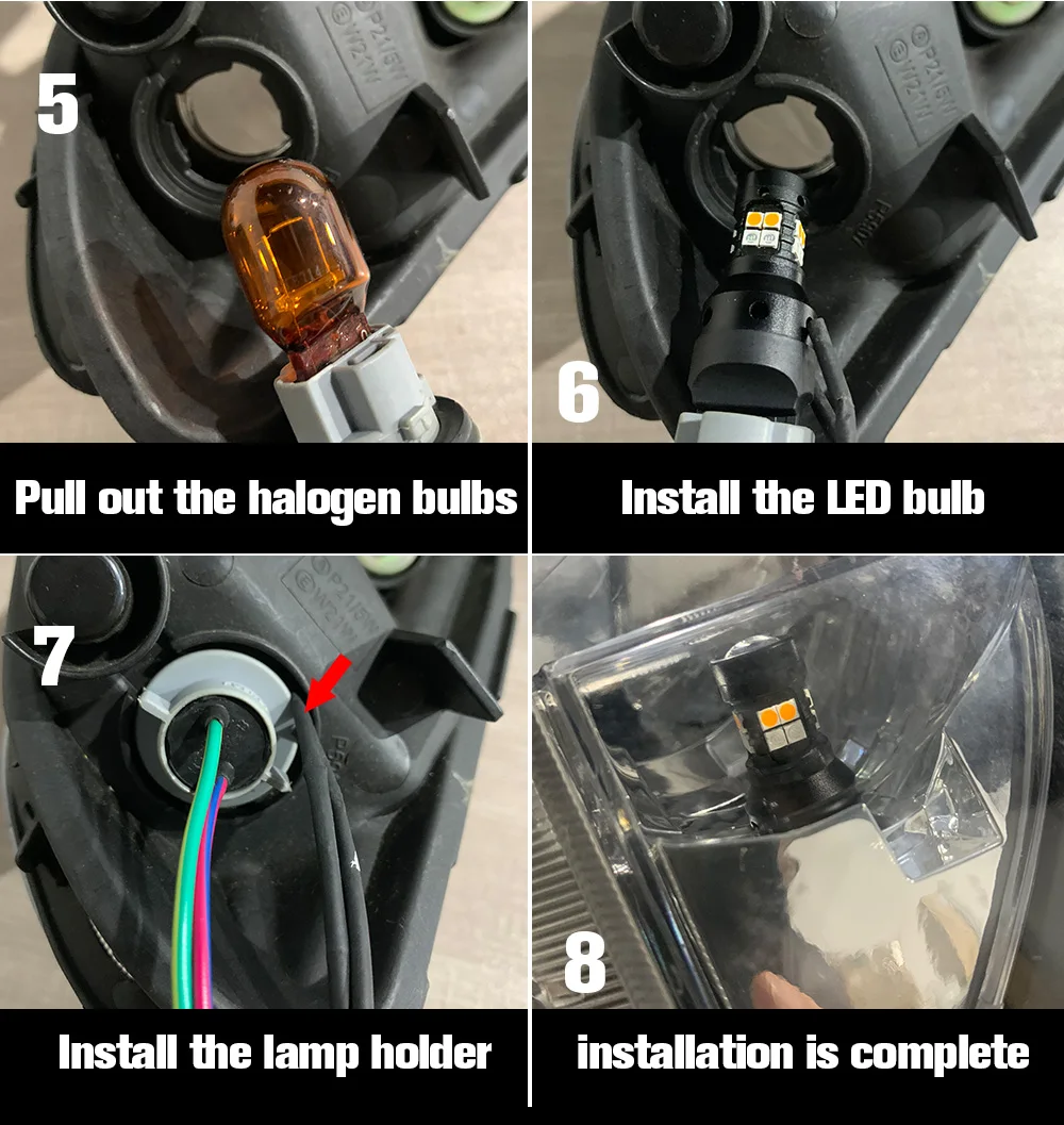 11.Install: Replace halogen bulb with LED light,then connect the daytime running light control line to the ACC fuse to obtain power;Bright day light when driving,change back to yellow light and twinkle when turning.